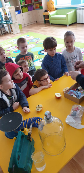 Wychowankowie podczas warsztatów ekologicznych oglądali jak wykonuje się doświadczenia z wodą. Dowiedzieli się w jakiej temperaturze jest gotowana woda i wielu innych ciekawych rzeczy.