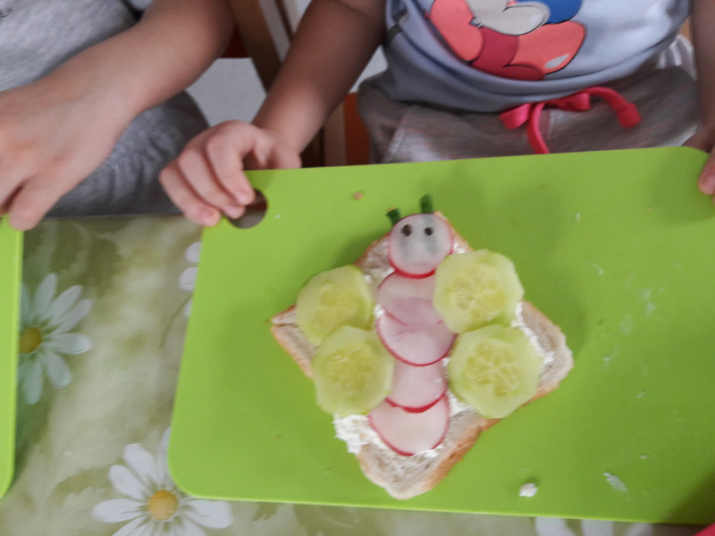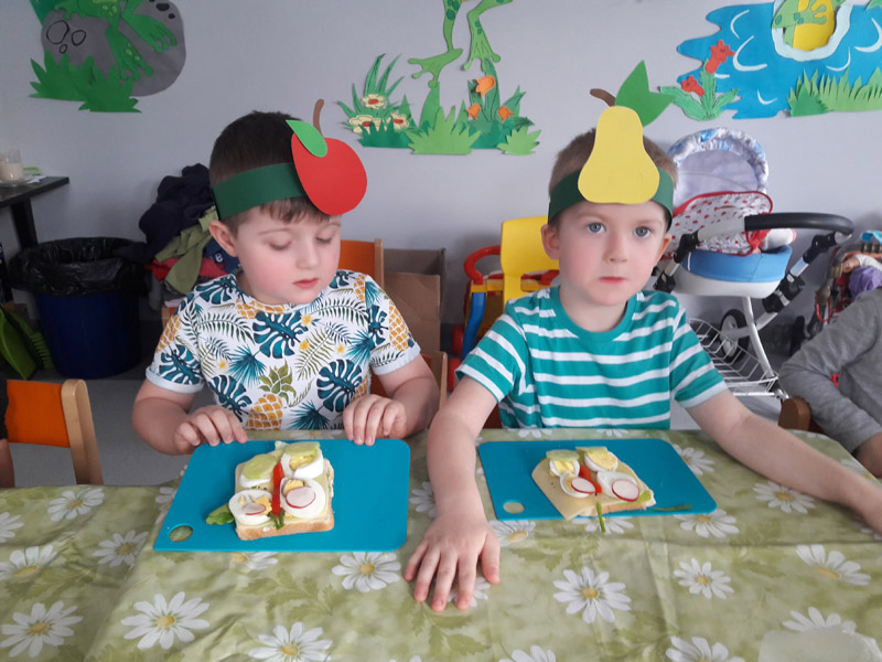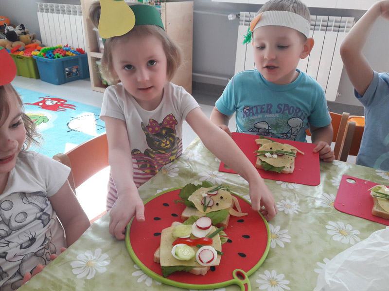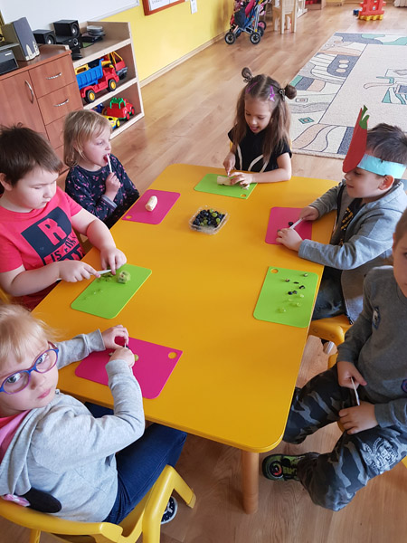 Każda grupa zrobiła witaminowe, owocowe lub warzywne pyszności, a później wspólnie zasiedli do stolików, żeby je zjeść lub wypić.