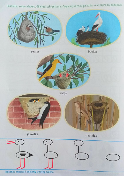 Osoby, które odebrały książki ilustrację znajdą w Kartach pracy cz. 3, str. 62. Dokończcie też rysować bociana według wzoru.